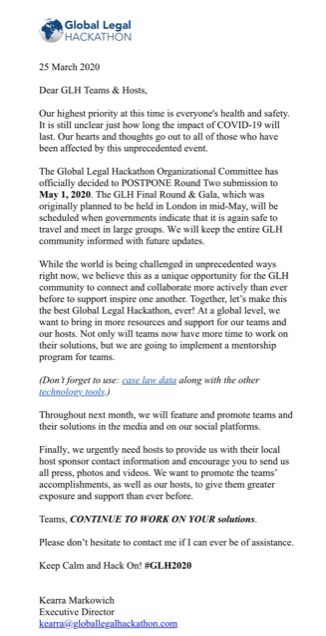 Global Legal Hackaton postponed Round Two submissionBy Editorial Department (Press Release)Mar 26, 20201 min readGlobal Legal Hackaton postponed Round Two submission to May 1, 2020. Read more here. #GlobalLegalHacketon #NeedtoRead #AllUpdates